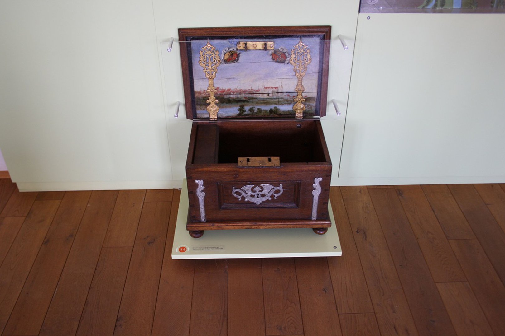 Innungsladen waren für die Zünfte im Mittelalter von enorm großer Bedeutung, stellten sie doch das Aushängeschild der Innung dar. Sie dienten nicht nur der Aufbewahrung wichtiger Dokumente und Wertobjekte, sondern besaßen auch eine zeremonielle Funktion. "Die hohe Wertschätzung kommt bei der Gestaltung der Innungslade der Torgauer Maurer von 1660 besonders zur Geltung", erläutert Kathrin Niese vom Torgauer Geschichtsverein e. V. die historische Bedeutung des Möbels. Die wertvolle Arbeit aus einem Eichenkorpus mit vergoldeten Beschlägen und Aufsatzschloss zeigt im Deckelinneren eine aufwendige Malerei der Torgauer Stadtansicht nebst Torgauer und Meißner Wappen.