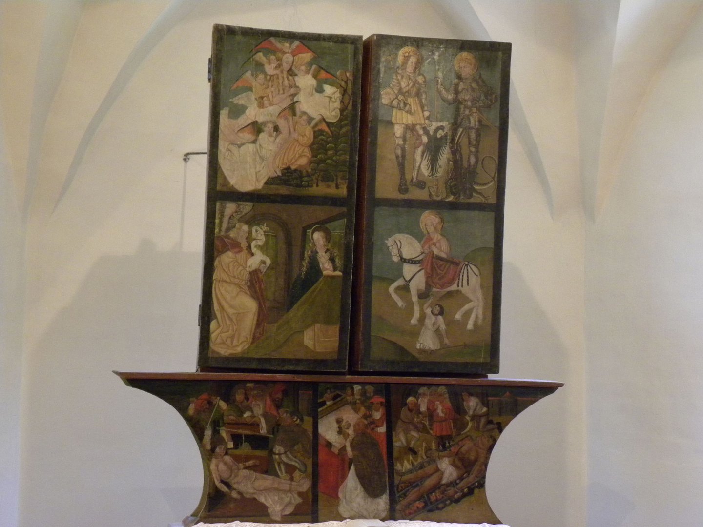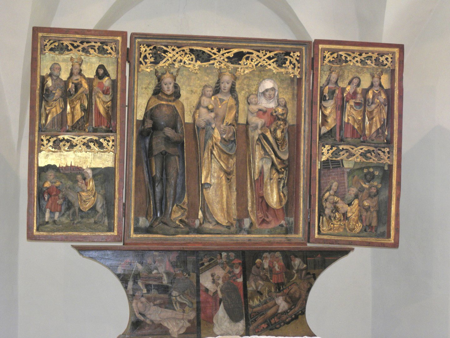 Im Mittelschrein befindet sich die Figur Maria mit dem Kind zwischen Anna und Georg stehend. Die beiden Seitenflügel beherbergen jeweils drei Heiligenfiguren. In der Predella werden die Martyriumsszenen des Erasmus und des Laurentius bildhaft dargestellt. Auf den Flügelrückseiten sind wiederum Georg und Martin über der Erhebung Magdalenas sowie eine Verkündigungsszene dargestellt.