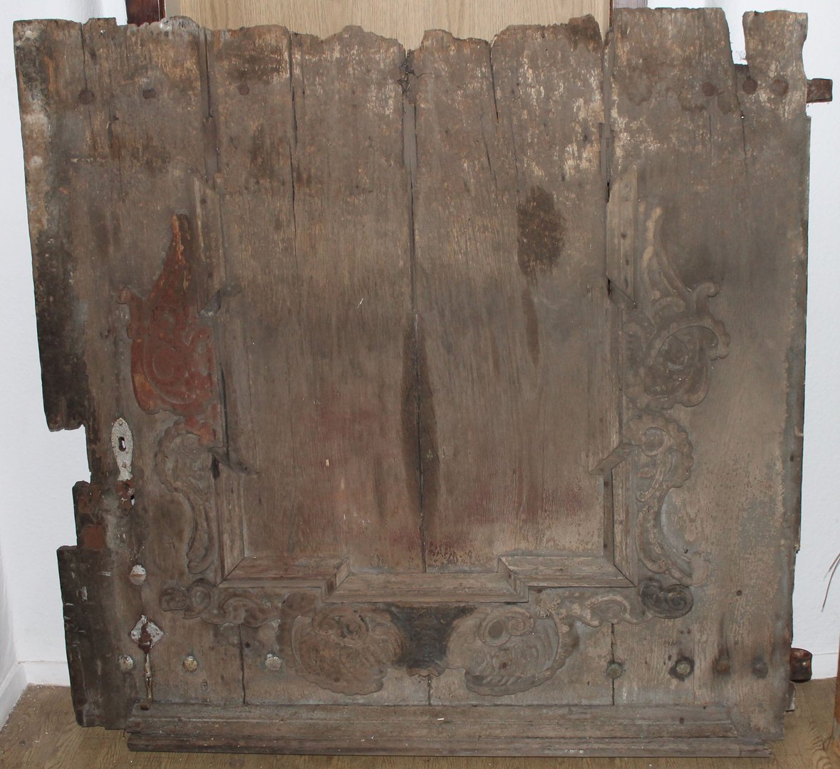 Die zweiteilige Tür, deren obere Hälfte früher separat bewegt werden konnte, ist mit hochwertigen aufgelegten Schnitzereien verziert: die Füllungen werden von Ohrmuschelwerk verziert, die obere Türhälfte wird von einer Maske in gesprengtem Giebel bekrönt. Die Originalbeschläge sind in Teilen noch vorhanden.