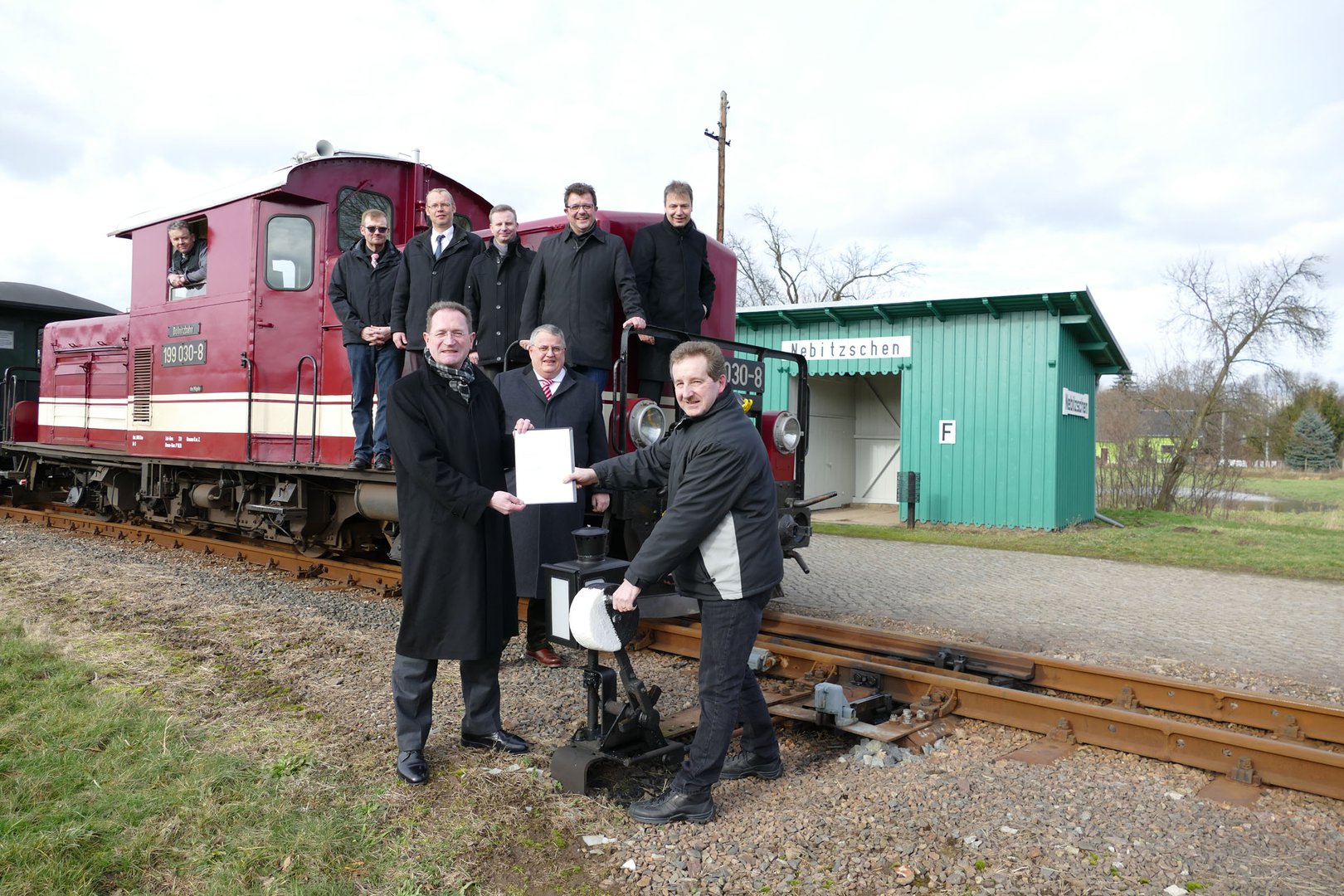 Mit insgesamt 50.000 Euro fördert die Sparkassenstiftung für die Region Torgau-Oschatz die Restaurierung des stillgelegten Streckenabschnitts der Döllnitzbahn von Nebitzschen bis Kemmlitz. Das Geld erhält der DBV-Förderverein "Wilder Robert", der sich seit 1994 um den Erhalt der mehr als 130 Jahre alten Schmalspurbahn kümmert. In Anwesenheit von Landrat Kai Emanuel, Oschatz’ Oberbürgermeister Andreas Kretschmar, Carsten Bräuer, stellvertretender Bürgermeister der Stadt Mügeln, sowie Matthias Müller, Bürgermeister der Gemeinde Wermsdorf, übergaben Dr. Harald Langenfeld und Stephan Seeger, Vorstandsvorsitzender der Sparkassenstiftung, den Fördermittelbescheid an den DBV-Förderverein.