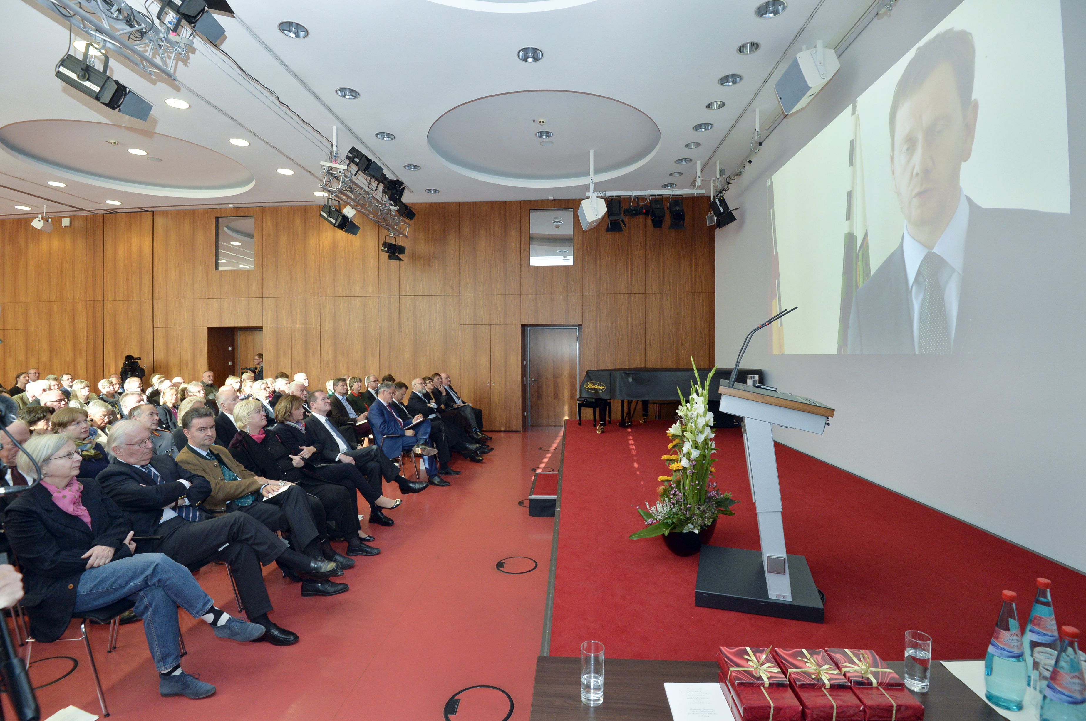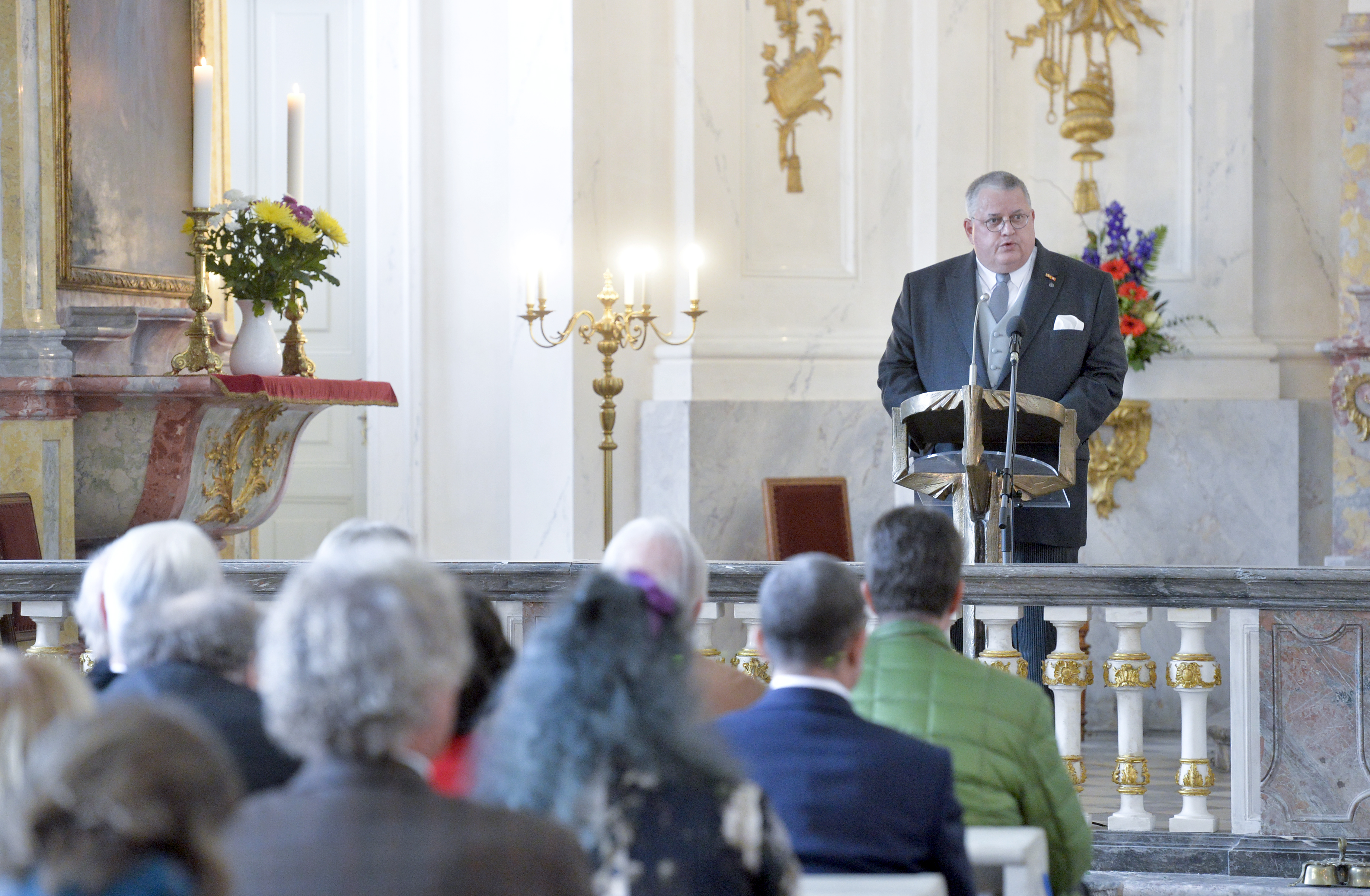 Etwa 200 Gäste aus Politik, Gesellschaft, Wirtschaft und Medien folgten der Einladung der Stiftungen der Sparkasse Leipzig zum Ökumenischen Gottesdienst in der Kapelle von Schloss Hubertusburg in Wermsdorf im Rahmen der Veranstaltung "Schicksalsgemeinschaft - Europas Zukunft 100 Jahre nach dem ersten Weltkriegsende", darunter auch Sachsens früherer Ministerpräsident Kurt Biedenkopf.