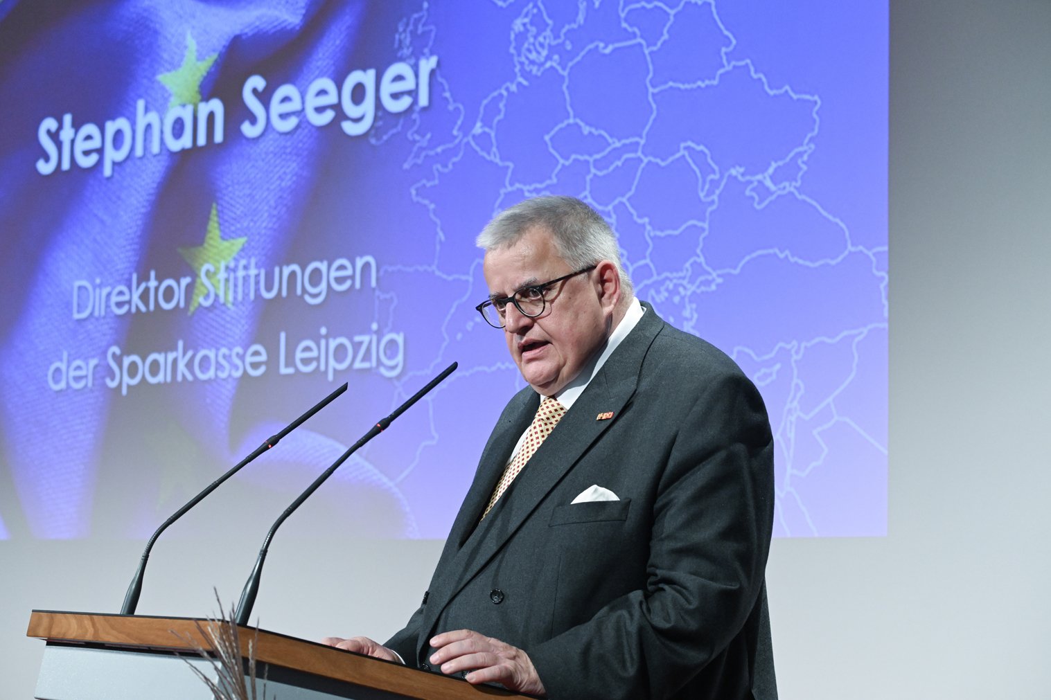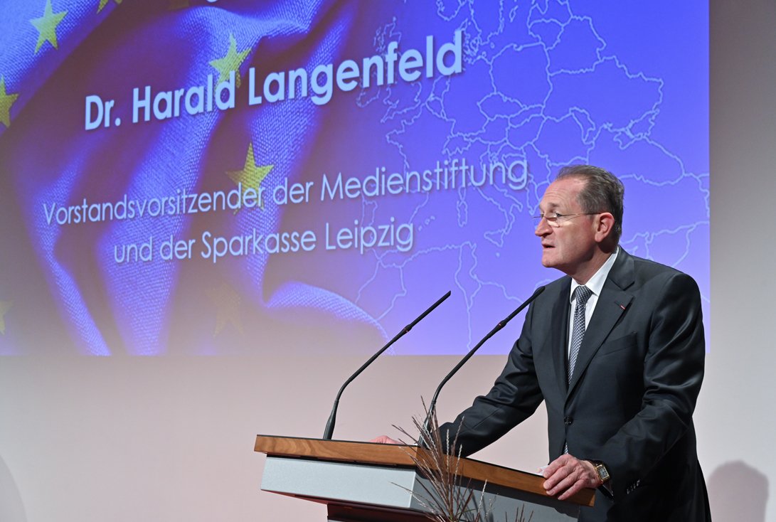 Mit einem Symposium "Schicksalsgemeinschaft - Verlorener Frieden in Europa" griffen die Stiftungen der Sparkasse Leipzig am 8. Oktober 2024 die Diskussionen um die Zukunftsfähigkeit Europas auf. Am Vorabend des 35. Jahrestages der ersten großen Demonstrationen in Leipzig, vor allem jedoch im dritten Jahr des Ukraine-Krieges, wies Dr. Harald Langenfeld, Vorstandsvorsitzender der Medienstiftung und der Sparkasse Leipzig, auf die steigende Kriegsmüdigkeit in der europäischen Gesellschaft hin: "Nach anfänglicher Solidarität mit der Ukraine zeigte die europäische Einigkeit schnell Risse und der Glaube, hier würden nicht nur die Ukraine, sondern auch unsere Werte und unsere Freiheit verteidigt, stößt auf eine sinkende Zustimmung und Zahlungsbereitschaft." Zugleich gefährdeten mediale Angriffe von außen den demokratischen Diskurs und trügen zur Spaltung der Gesellschaft bei. Mit dem Symposium wolle man dazu beitragen, "frühzeitig auf Gefährdungen hinzuweisen, Ursachen zu benennen und dagegen anzukämpfen." Es gelte, "Europa als gemeinsamen Raum des Vertrauens" zu erhalten: "Und in diesem Sinne eine Wertegemeinschaft, die sich nicht abschließt, sondern als offene Gesellschaft ein Angebot macht für Demokratie und Meinungsfreiheit, für Vielfalt und ein friedliches Miteinander", so Dr. Langenfeld.